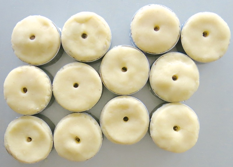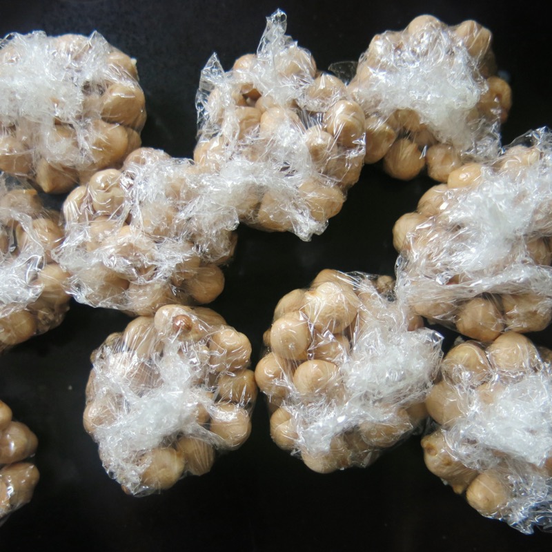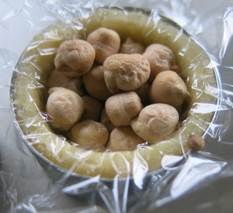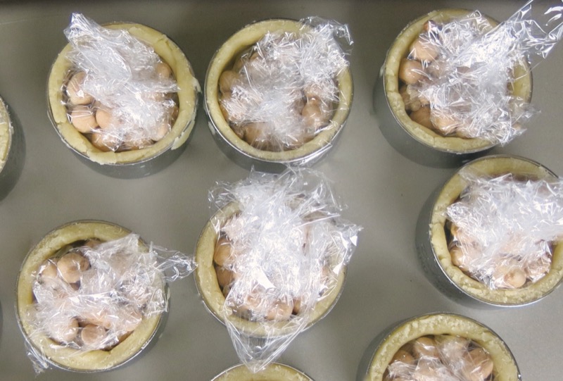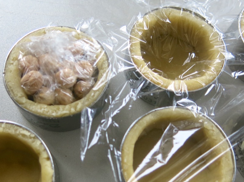 I have used rice and any kind of small beans for this process. Today, I had dried garbanzo beans in the baking bag as they were used most recently. Each tart needs a small piece of plastic covering it. The beans or rice go inside to keep the walls from shrinking and the bottom from puffing up. The plastic is then closed around “the filling”.