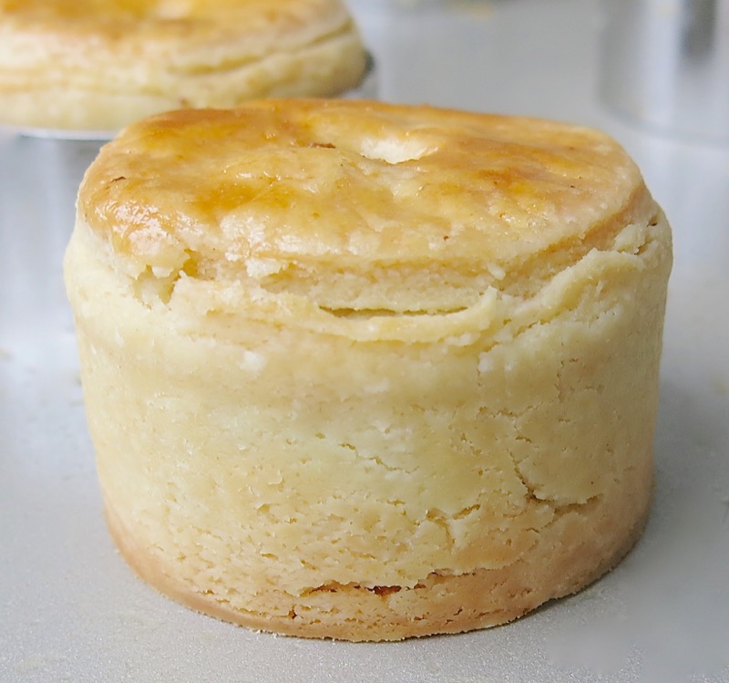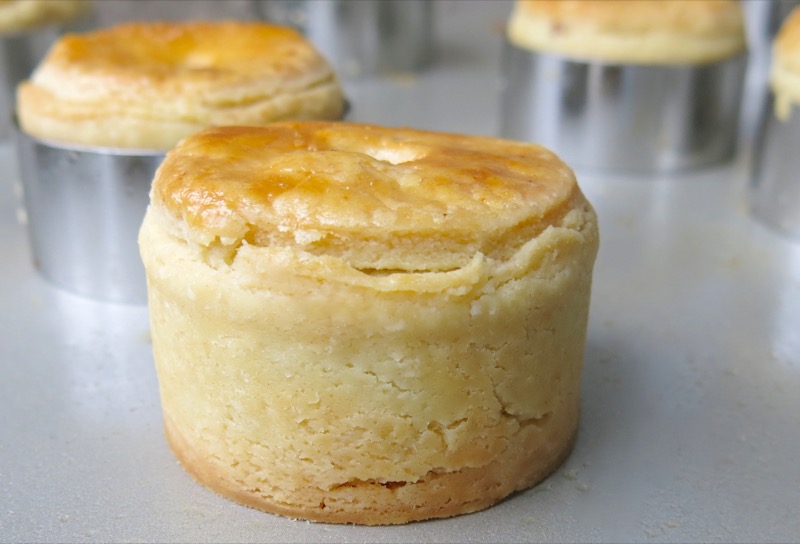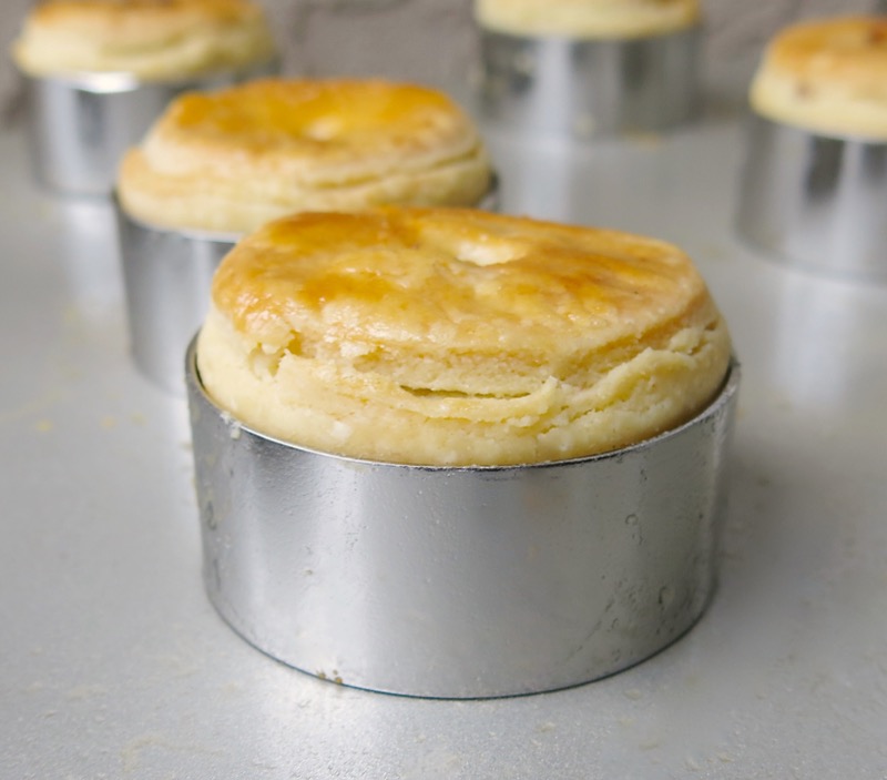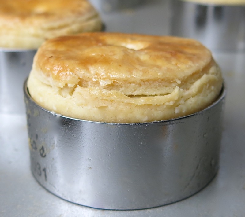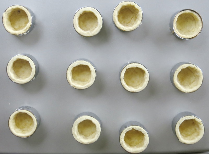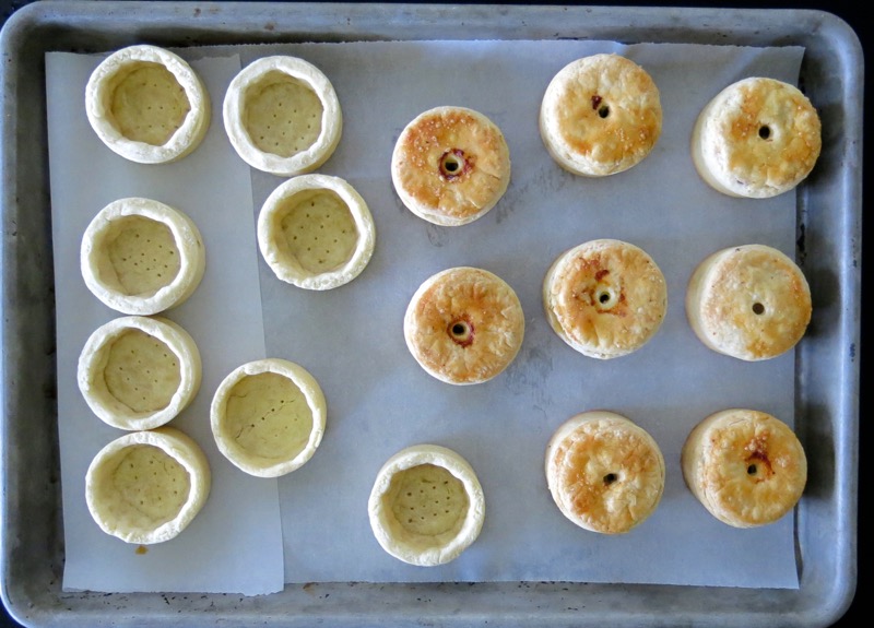 I had decided to make 2 dozen as I had one dozen rings. One dozen would be blind baked open shells that would be filled just prior to service with any kind of hot steaming savory concoction, and the other would be closed as the higher walls on this miniature ring mold provided the opportunity to make a miniature meat tart that would imitate the large savory pies I make using spring form pans. All grown up and still love to play house! Yup!