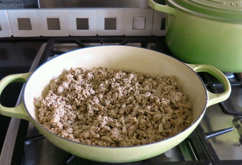 - Stir to combine; saute together, stirring frequently until onions are translucent and meat fully browned