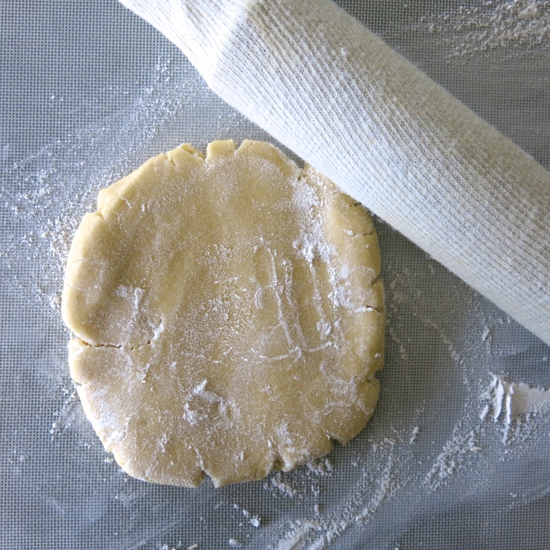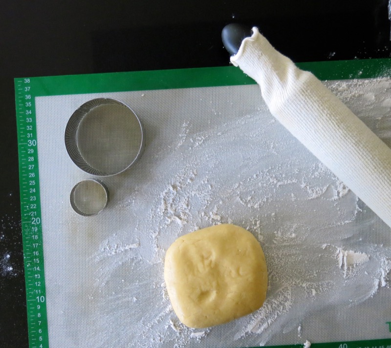 Once the beautiful, well smeared eggy dough has been chilled and rested, ready the work surface with a mat, a pastry rolling cloth, or parchment paper, lightly dusted with flour. I always use a pastry sleeve over my rolling pin, as well. Pastry cloths and sleeves work miracles as both avoid stickage and I like the pattern the sleeve makes in the dough.