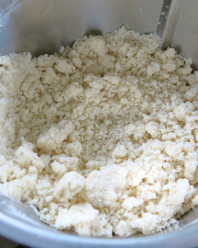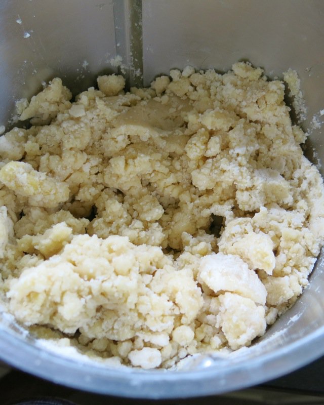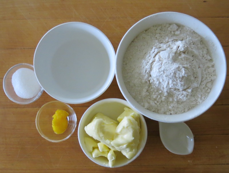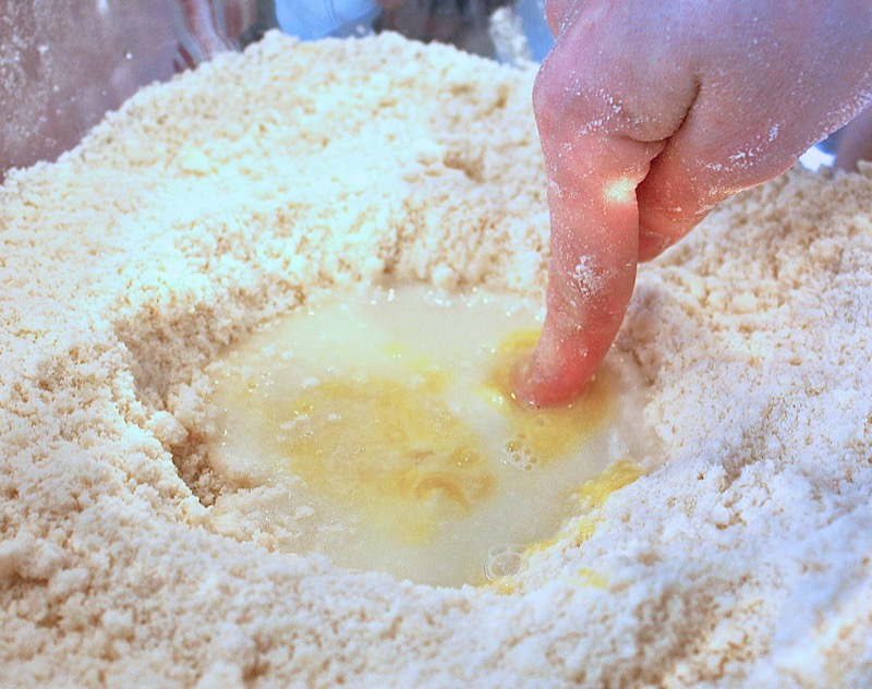 After working the butter into the flour and salt with one’s fingers until oatmeal-like, the egg yolk and water are added to a well made in the middle. The traditional hand method is then to use one finger to work the dry ingredients slowly and purposefully into the wet until full incorporated.
