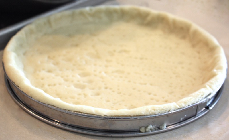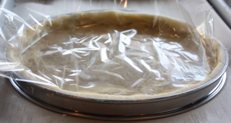 - Poke holes in the dough, line the crust with plastic wrap and fill it with beans or rice to keep the bottom from puffing and the sides from falling