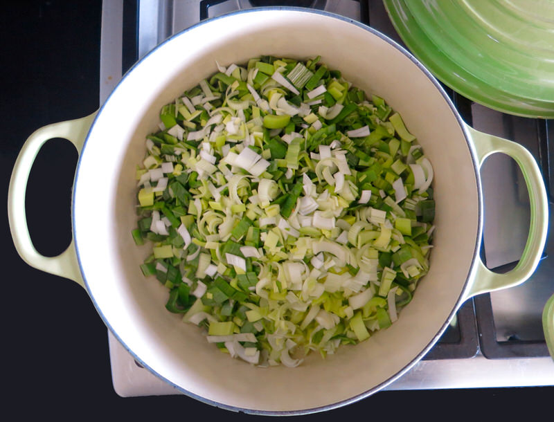 Leeks are cleaned, chopped and plopped into a pot well versed in butter.