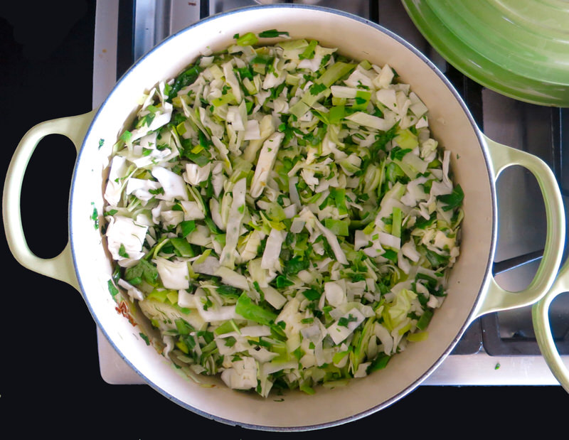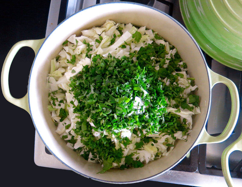 Cabbage (savoy is best, but use what you have on hand) or kale or any strong leafy green and flat leafed parsley are chopped and added.