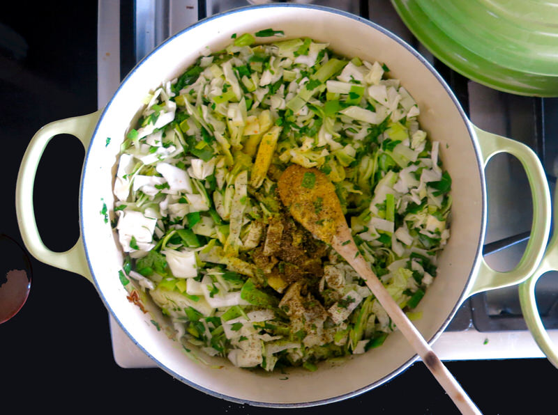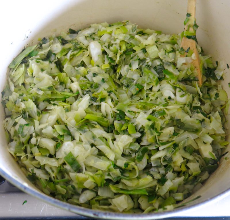 Stir constantly until leek and cabbage are limp and transparent. This is not the time for cooking the vegetables al dente. This is the time to simmer them into soft buttery submission.