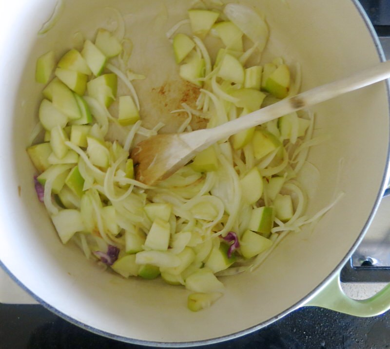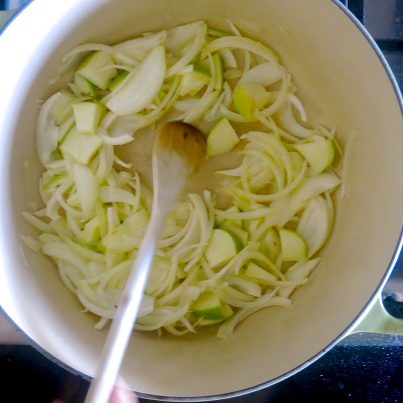 - Place onion and apple into heavy pan with butter; saute until translucent
