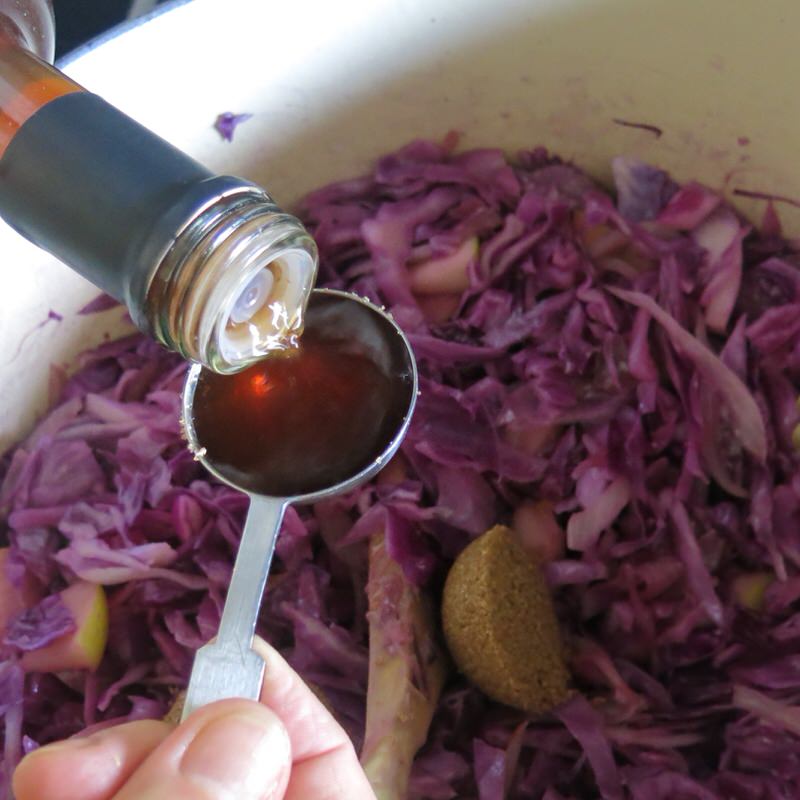 Then about 1/4 cup of water to enable braising to be replenished only if the cabbage starts to stick to the bottom of the pan.