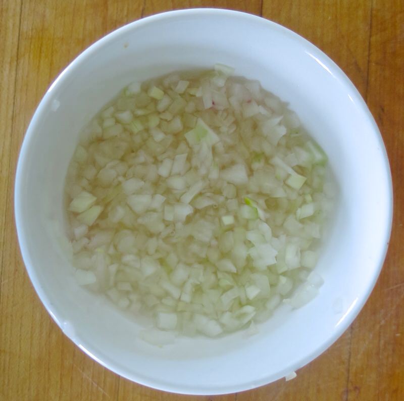Covering the minced onion with the vinegar and letting it sit pickles them and takes away the sharp bite of the onion. Margaret said her mother prepared her onions like this every time she made a salad. Then, they are added to the mix!