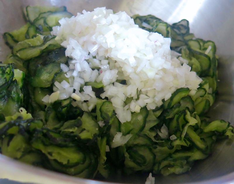 Actually, Loreto squeezed the cucumber exactly as I would have, but I would have had to work much harder at it – yet, it was a bit too much, according to Margaret’s “usual” recipe. She squeezed them by hand and later told me when reviewing the recipes, that this one usually has a little liquid at the bottom of the bowl that serves as part of the dressing. I’ll have to try that, but loved it this way, in any case.