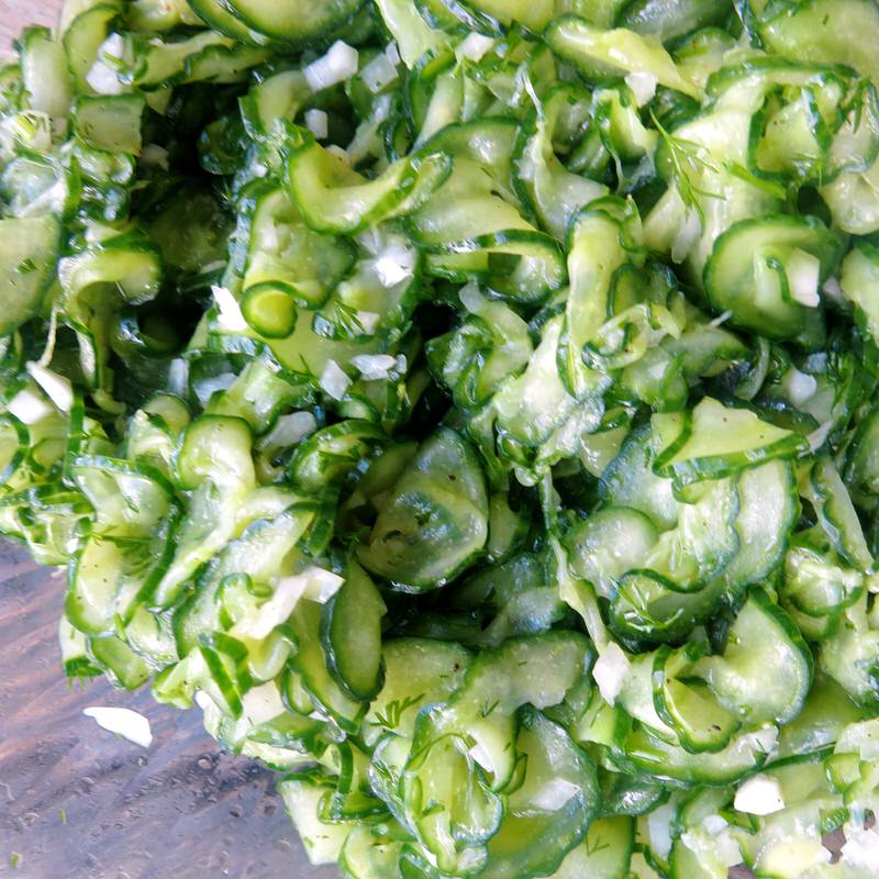 - Slice Cucumber into very thin slices using a mandoline; place in large bowl
