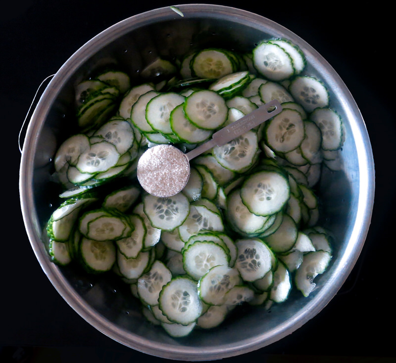 Once sliced, every slice needs to be coated with salt to enable extraction of the liquid within the cucumber.