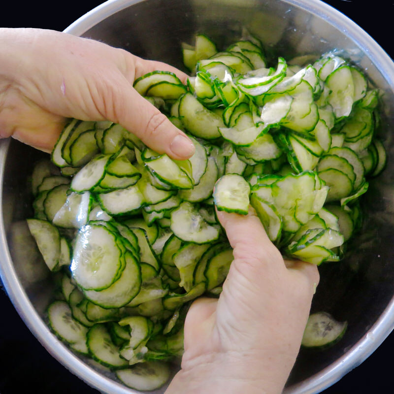 Cucumber Dill Salad or Gurkensalat: Squeezing the Slices