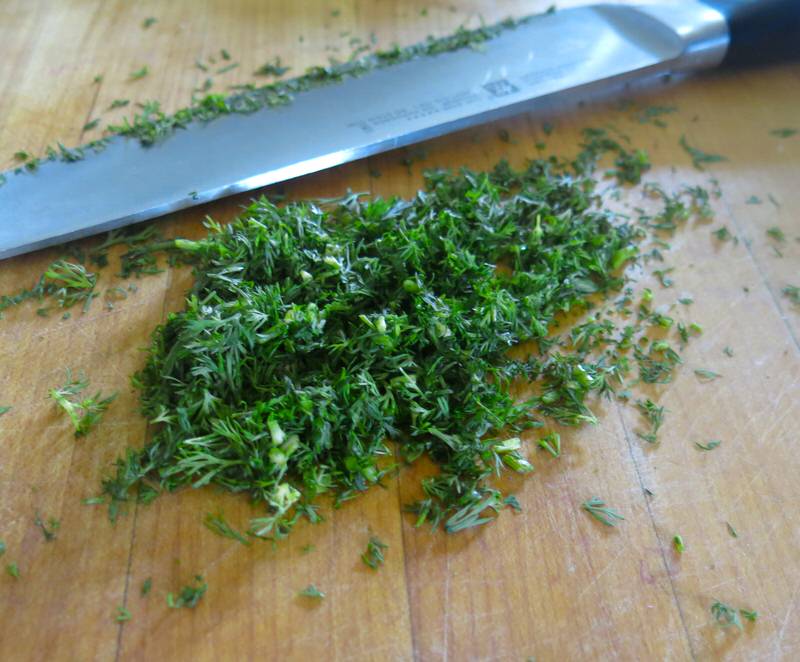 Margaret visited and revisited these tender slices several times ensuring the thin slices separated so each received salt throughout the process while Nicoletta minced the onion and the dill.