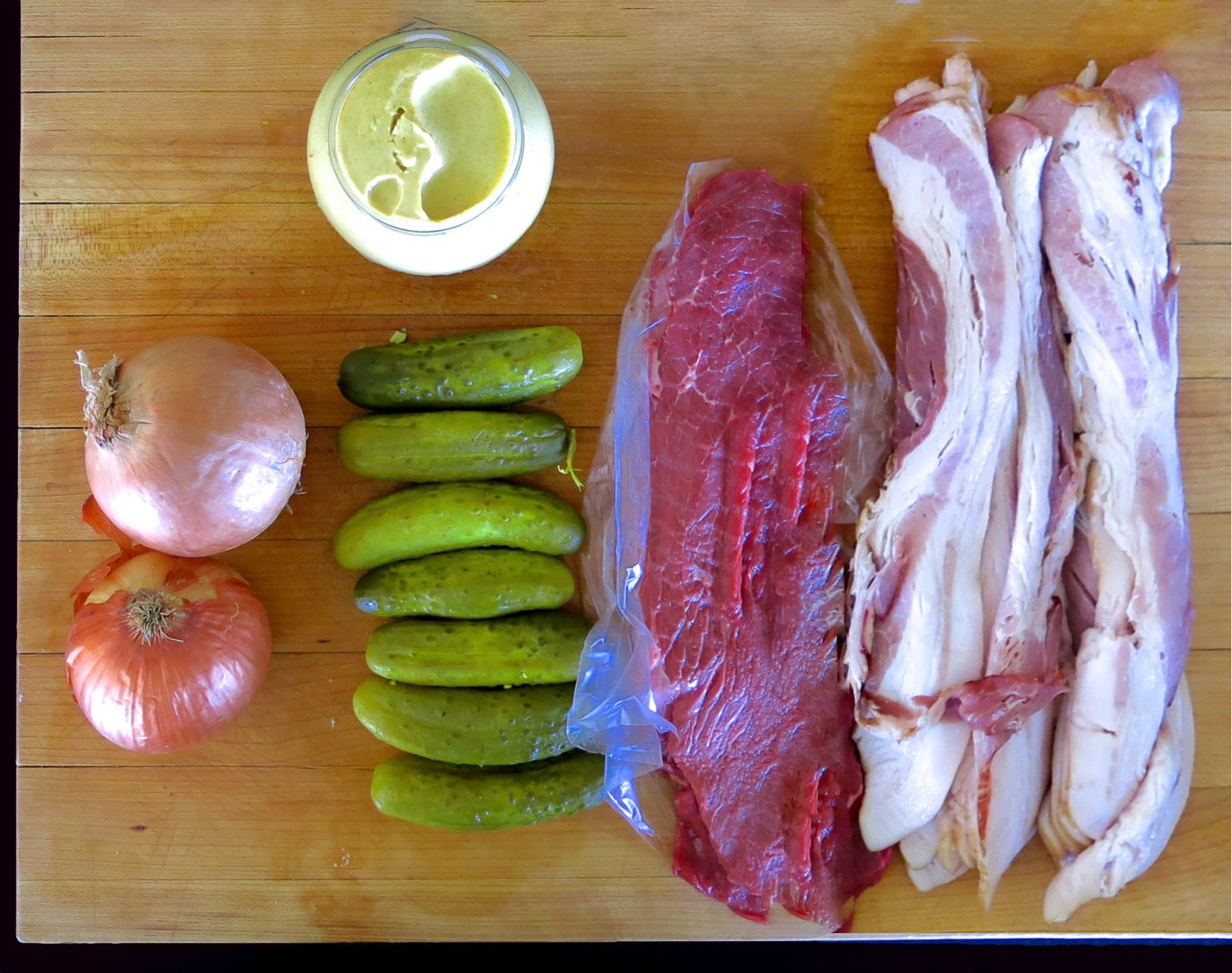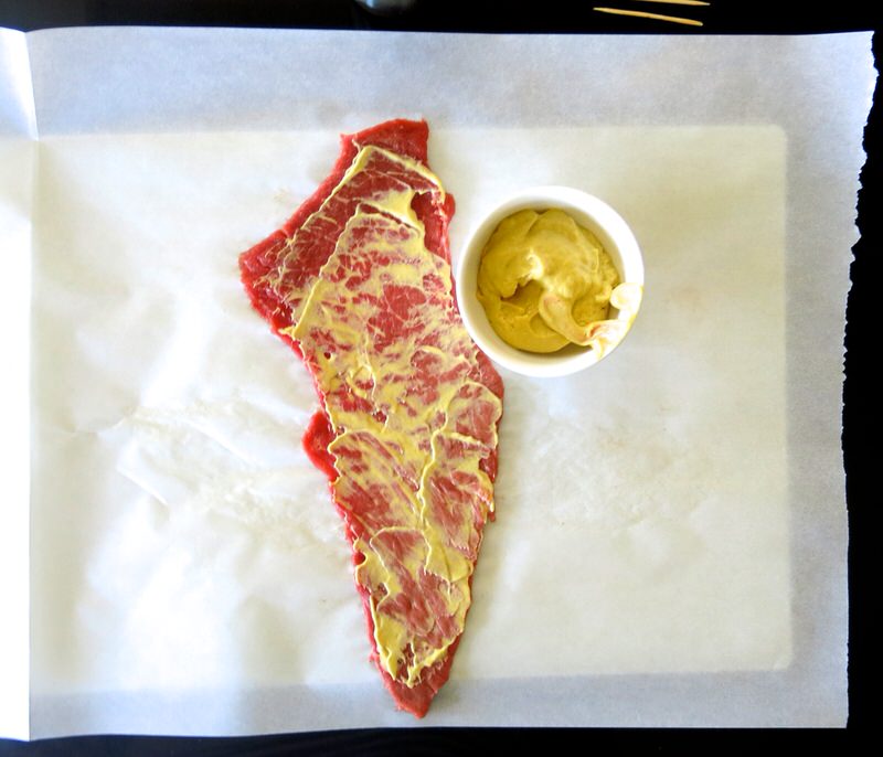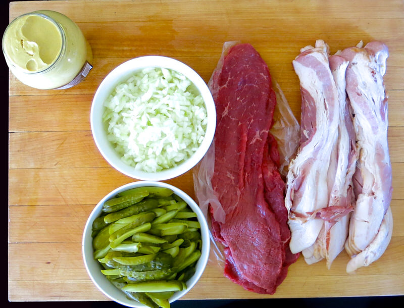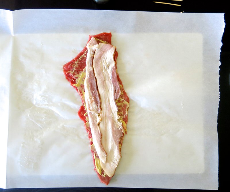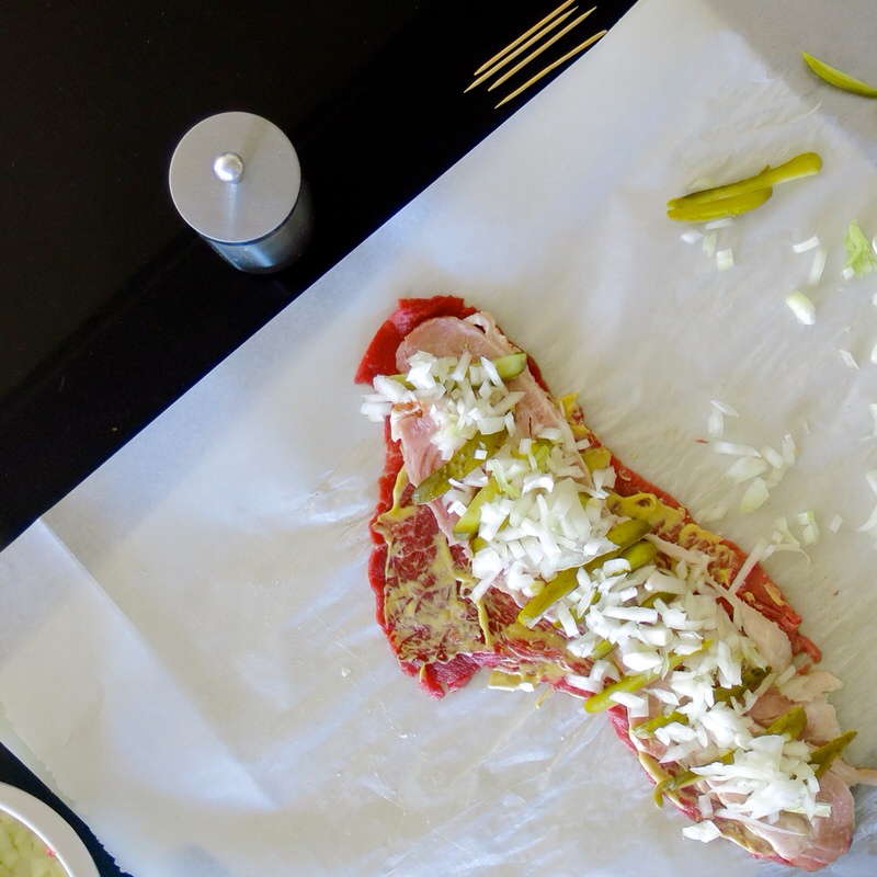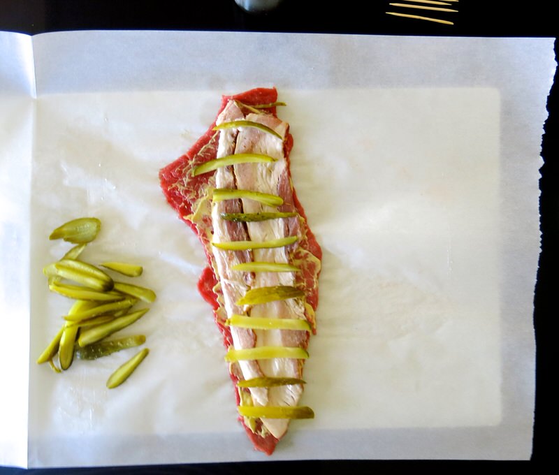 Thin end down, layer the meat: mustard, bacon, pickles, and onion. Then roll it all up up as tightly as possible, securing with a toothpick.