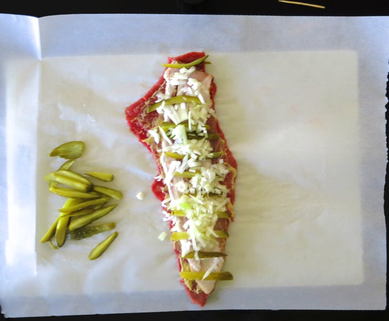 - Lay pickle strips horizontally along bacon slices; sprinkle chopped onion over bacon and pickle, also leaving the same 2 inches (5cm) of beef free of bacon