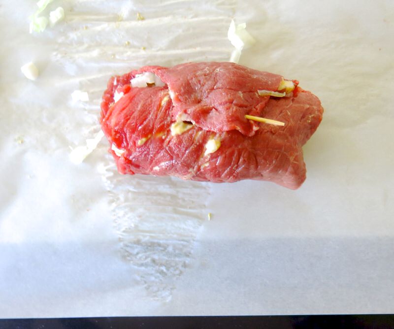 - Lay one roulade out on your cutting board thin side toward tummy in vertical position; spread lightly with Dijon