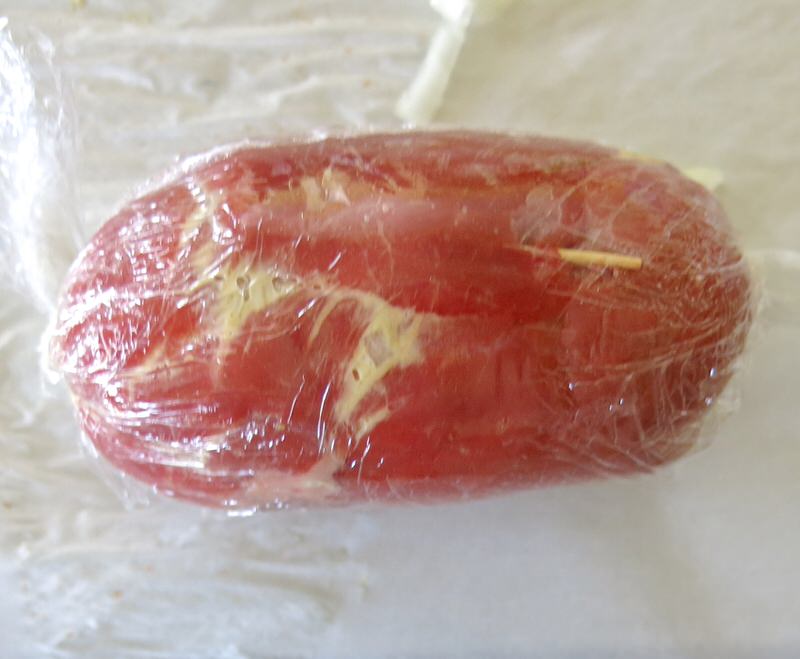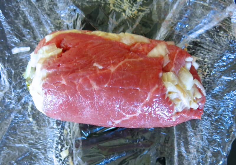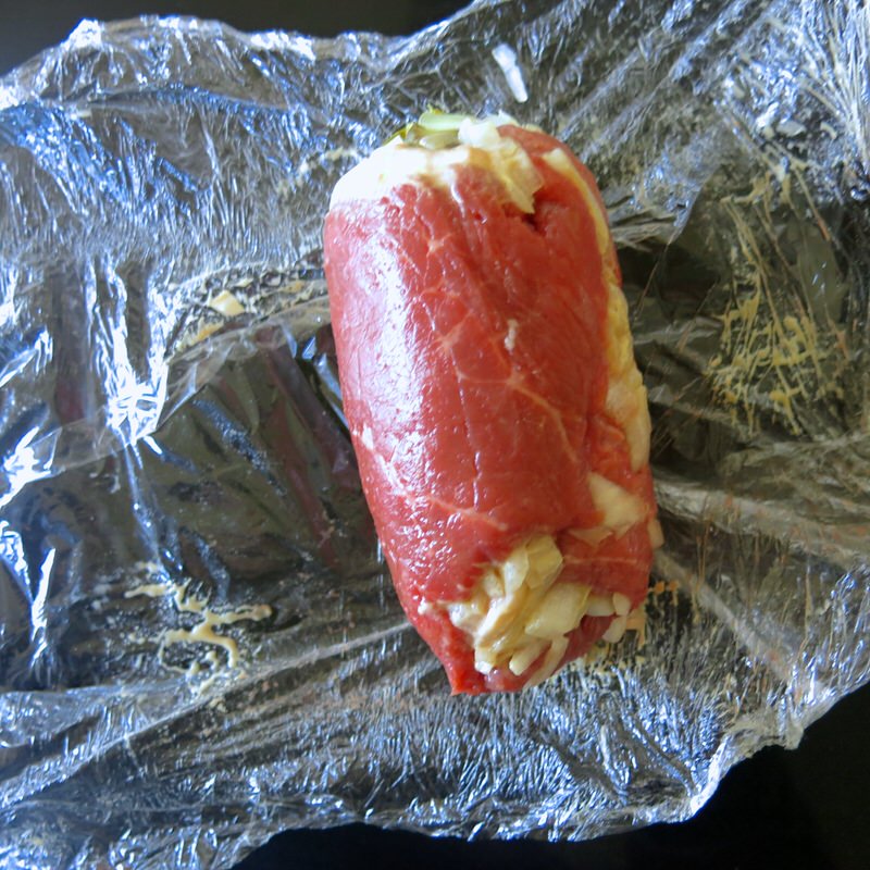 - Start with the full end of beef closest: roll as tightly as possible, using both hands to tuck in filling