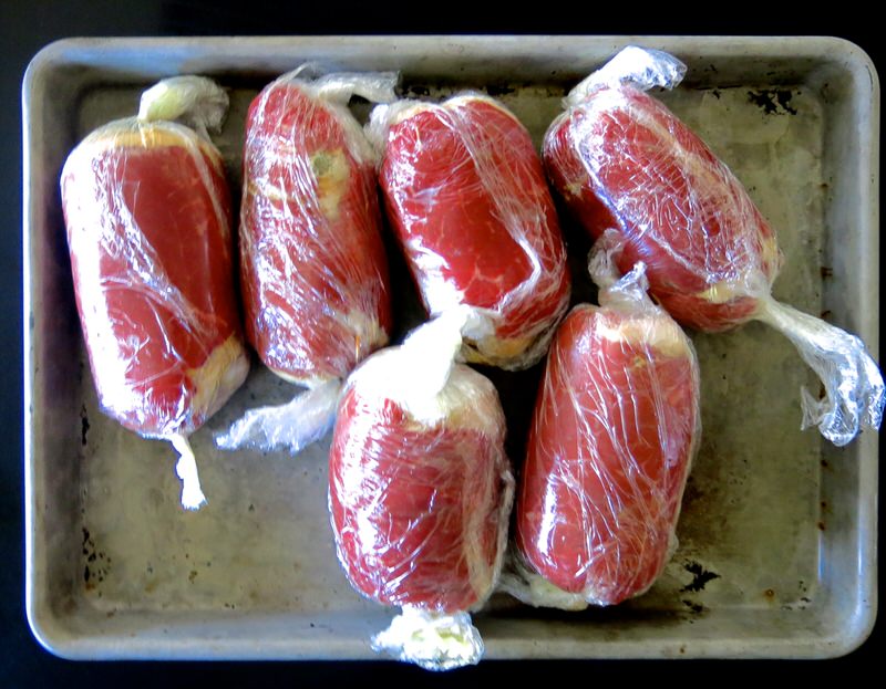 Simple, simple simple ingredients. Gorgeous know-your-farmer Alberta Beef. Best to go to the butcher to get it sliced for you as they know what rouladen is and will give you advice and get it done well. Know-your-farmer bacon is equally important. When using simple ingredients, each must be of highest quality. With bacon, all of the flavour is in the fat. The Berkshire Boar from Irvings Farms is one of my personal favourite bacons, but we usually have Tammworth bacon in our freezer from Nature’s Green Acres, though had just run out before making this recipe. Homemade dill pickles would be “the bomb”, but I didn’t make these. And the mustard? Traditionally, it must be Dijon. Period. However, I am looking forward to mixing it up next time with my favourite Alberta mustard: Traditional Whole Grain Prepared Brasicca Mustard. Am over the moon about this stuff and it is not easy to find, for some reason. I wouldn’t mess with anything else in “real life”, but with my creative juices now flowing, the dill could be substituted with multi-coloured bell peppers for my Eastern European man to switch up the Sunday Supper routine, too! However, don’t even think of messing with this recipe when making the real thing ’cause this is the real thing.
