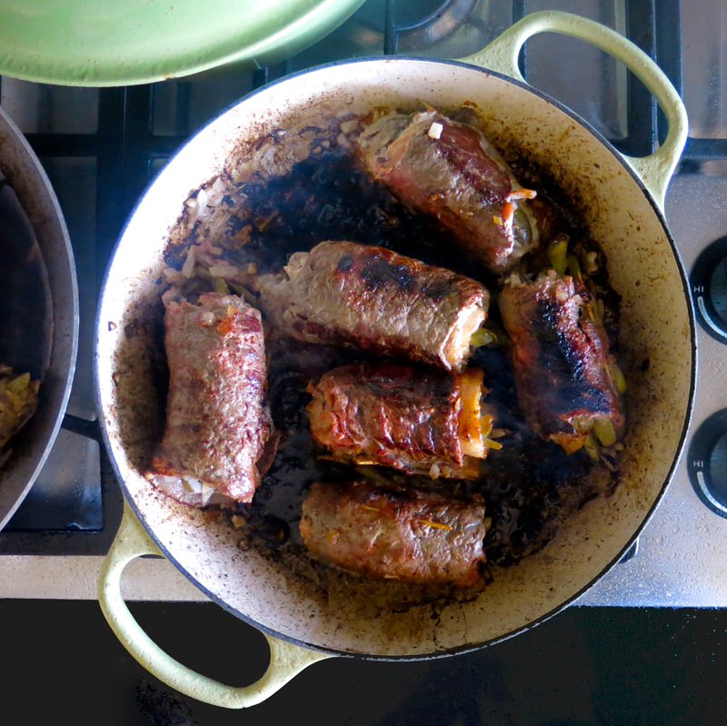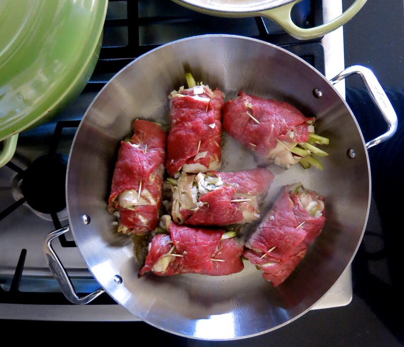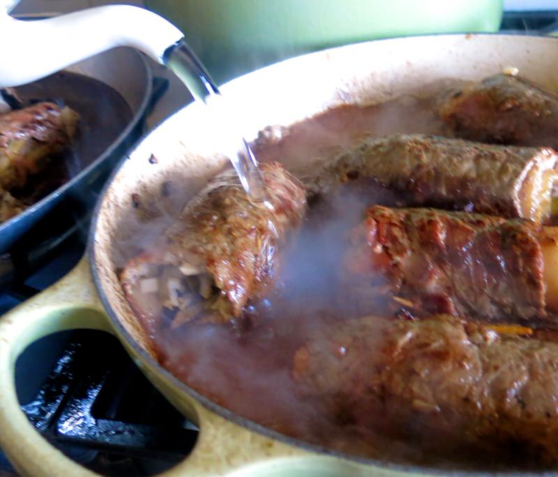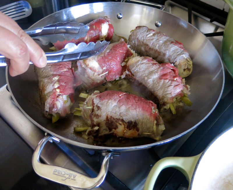 - Heat oil in heavy pan; sauté rouladen, turning to brown all 4 sides (about 4-5 minutes per side)