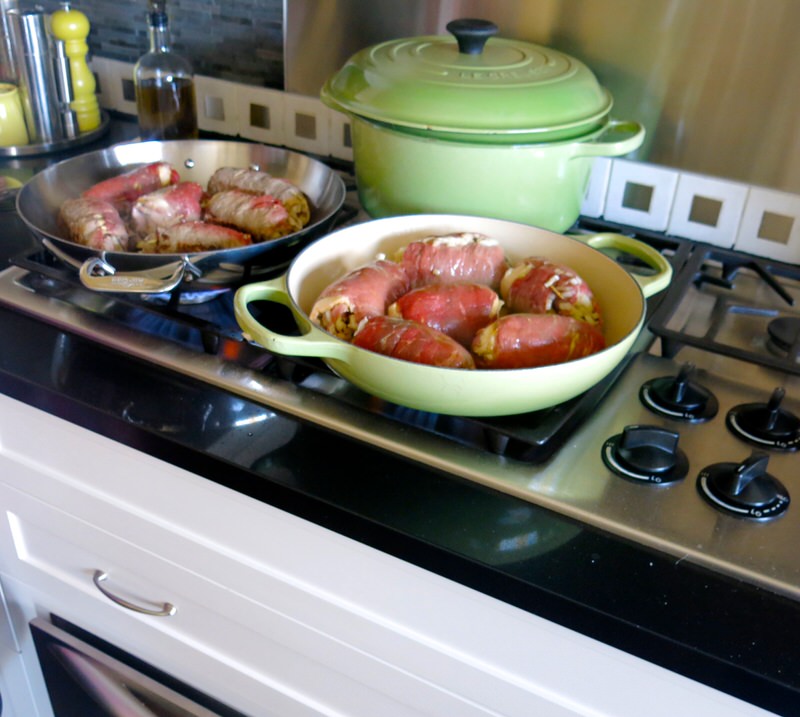 So, we’re both browning our rolls on the stove top with grease splatters flying everywhere. That’s the only downside of this preparation, but it is to be expected when browning anything. Usually, I try to make these kinds of dishes on my outside stove to avoid the slippery floor. However, this was simply too much fun and well worth the extra 10 minutes it took to wash the floor after. And, I will add, dear Margaret, that my stove top is the easiest to clean, ever.