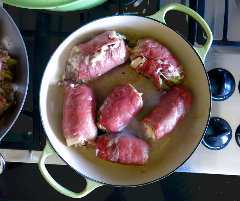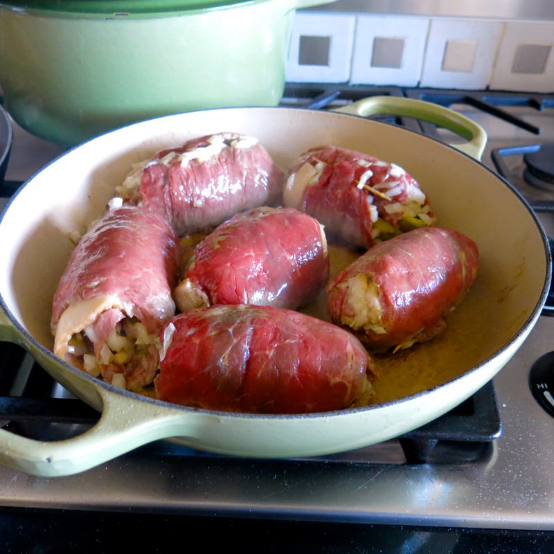 - Pre-heat oven to 325°F; select heavy casserole or braising pan with lid that will hold rouladen in single layer