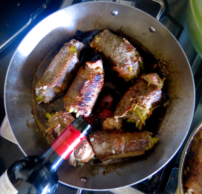 - Remove and place each in casserole in single layer; deglaze pan with red wine and pour over rouladen