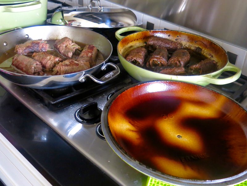 After a good 2 hours braising in a 325F oven, the rouladen reared its head proudly, but differently, depending upon the pan it was cooked in. Margaret used my All-Clad braising pan and I used my Le Creuset braising pan. The caramelization on her meat had almost been steamed off and my rolls were darker and more intense. Look at the lid! Obviously, the Le Creuset retained much more heat. We were both disappointed to see her rolls after opening mine, yet, the sauce was delicious and the flavour was all there. She found my sauce a bit bitter. Loretto found it more “wine intense”. I didn’t taste bitterness, but a more distilled sauce. The flavours were intensified.