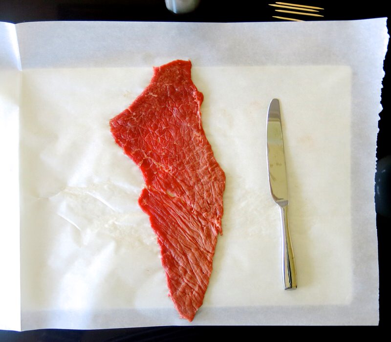 - 6 thin slices of a know-your-farmer beef (partially frozen inside round works well)