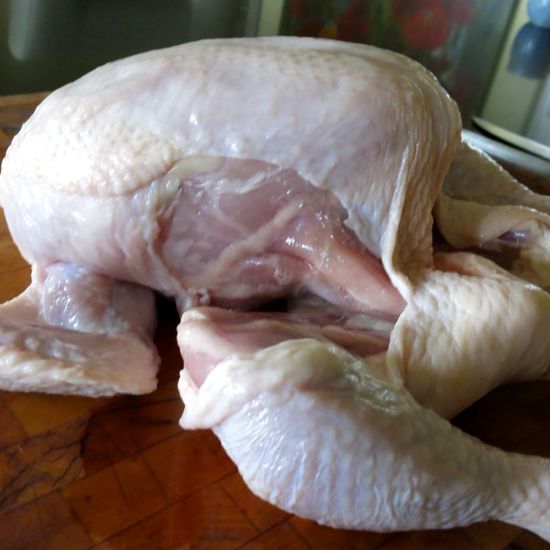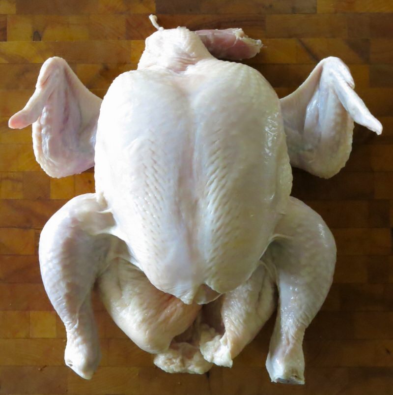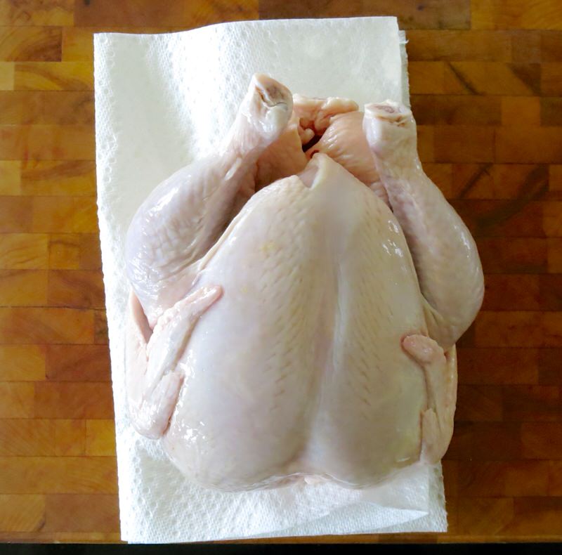 - Pat chicken completely dry inside and out (avoid washing regarding salmonella contamination concerns); remove innards and set aside