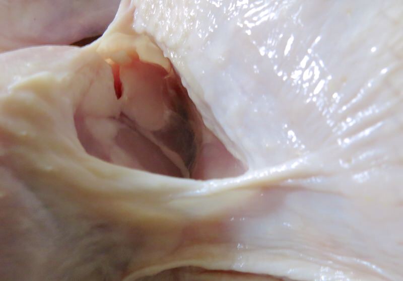 Using a very sharp knife, slit through the skin flap at the inside top of the leg. Open widely to peer in to see where to cut.