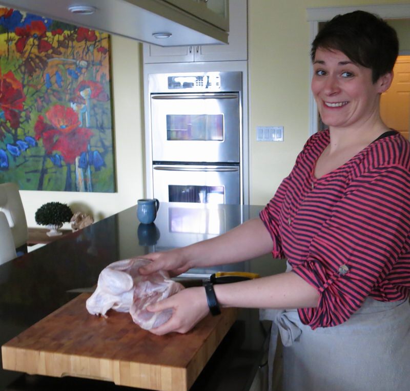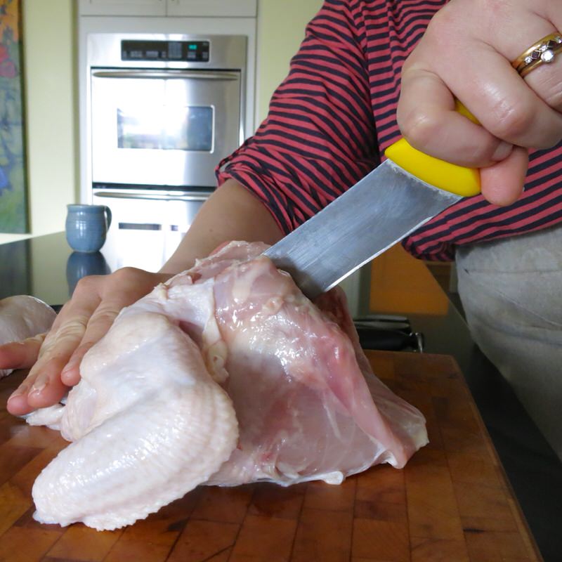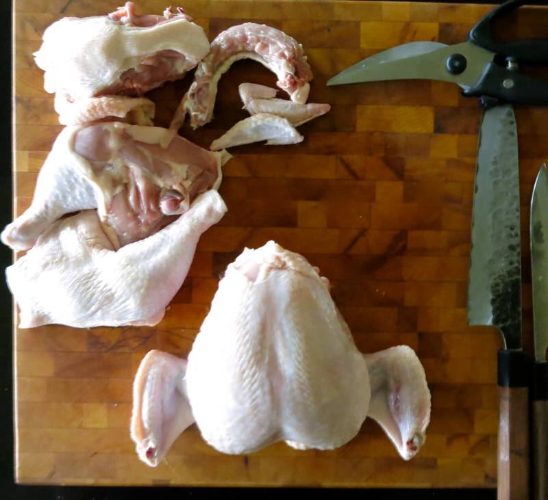 Today, with Elyse, I am definitely the student. This is the first time I know I can succeed at butchering a chicken with ease. I have butchered chickens all my life. Learned it from the now famous episode of Julia Childs on The French Chef butchering a chicken, yet when photographing Allan’s lesson, learned there was so much more I did not know. And, today, after Elyse’s lesson, have a simple guide to butchering a chicken into 8 even-sized pieces. My mantra: if I can do it, you can do it.