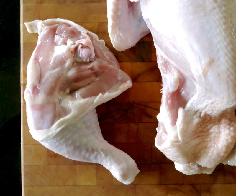 She makes it look so easy, and it truly is. If you follow along with each video, I promise you, you will never again buy a whole chicken cut into pieces. It is more economical to do it yourself, and you can also cut the pieces the way you like them. The legs are removed, above, and you then slice through each side to reveal the back piece. Fold it back, as above. Using the same process, slice it off. It is a perfect piece for soup stock as there is so little meat on it. However, my mom would fry it and no one complained. It was still delicious.