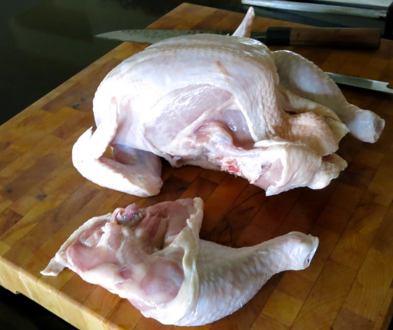 - Make a cut in skin between leg and breast; push the leg away from body and leg-joint should pop open