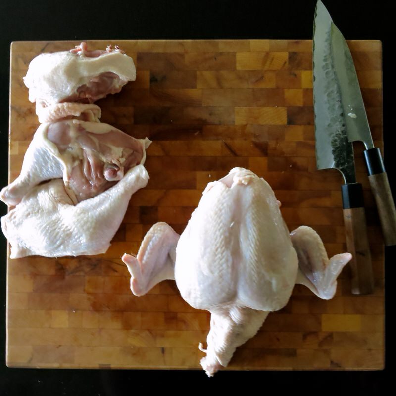 Now that the chicken is portioned into 8 fairly evenly sized pieces, a little talk about knives for butchering before completing the recipe.