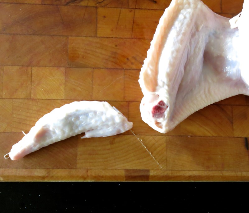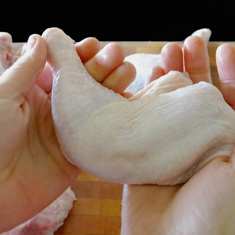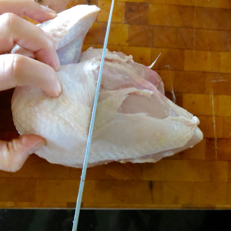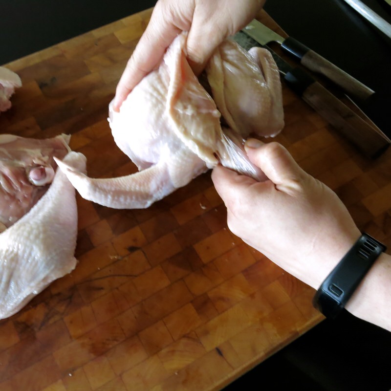 - Fold back piece over to expose bone joint and slice through to remove; set aside with soup stock bits