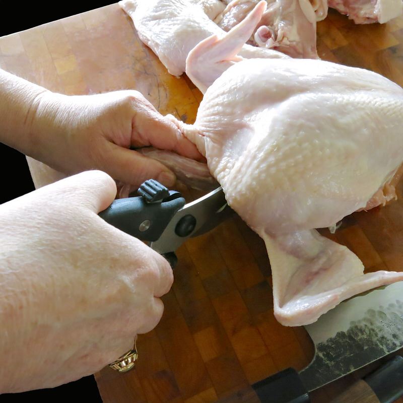 - Find base of neck with fingers; use kitchen sheers to cut off neck at base (may take two cuts) and remove aside with soup stock bits