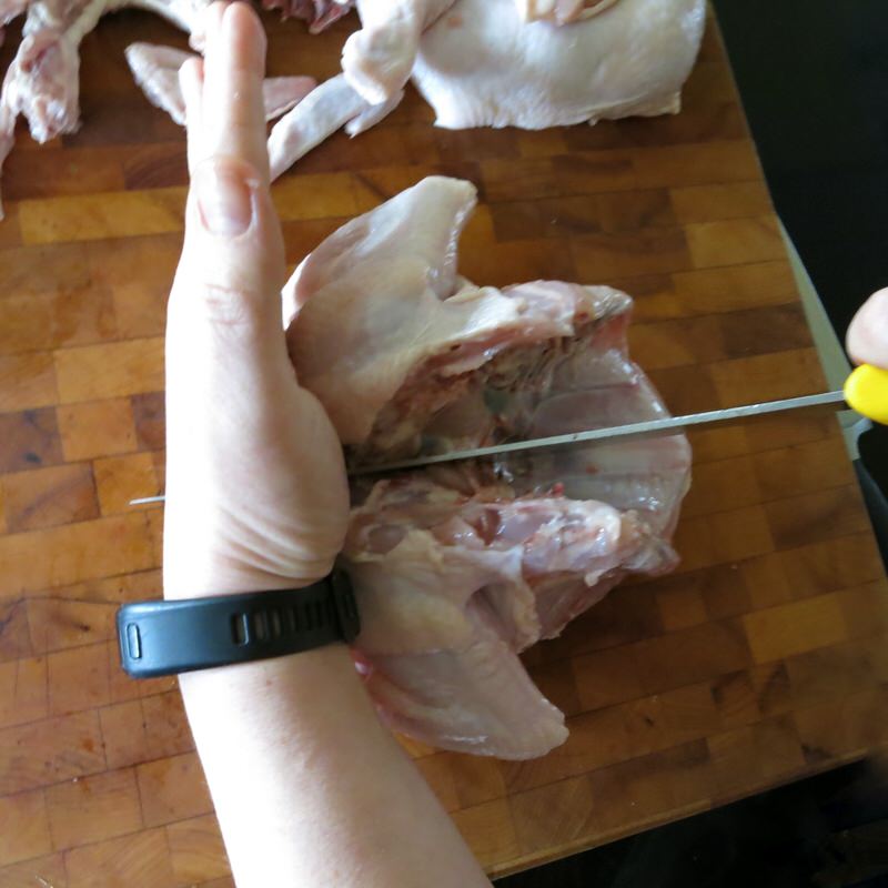 After the back piece and neck are removed, it’s time to remove the backbone: the last of the soup stock pieces. This is also done with kitchen shears – a simple cut through on either side. Done!