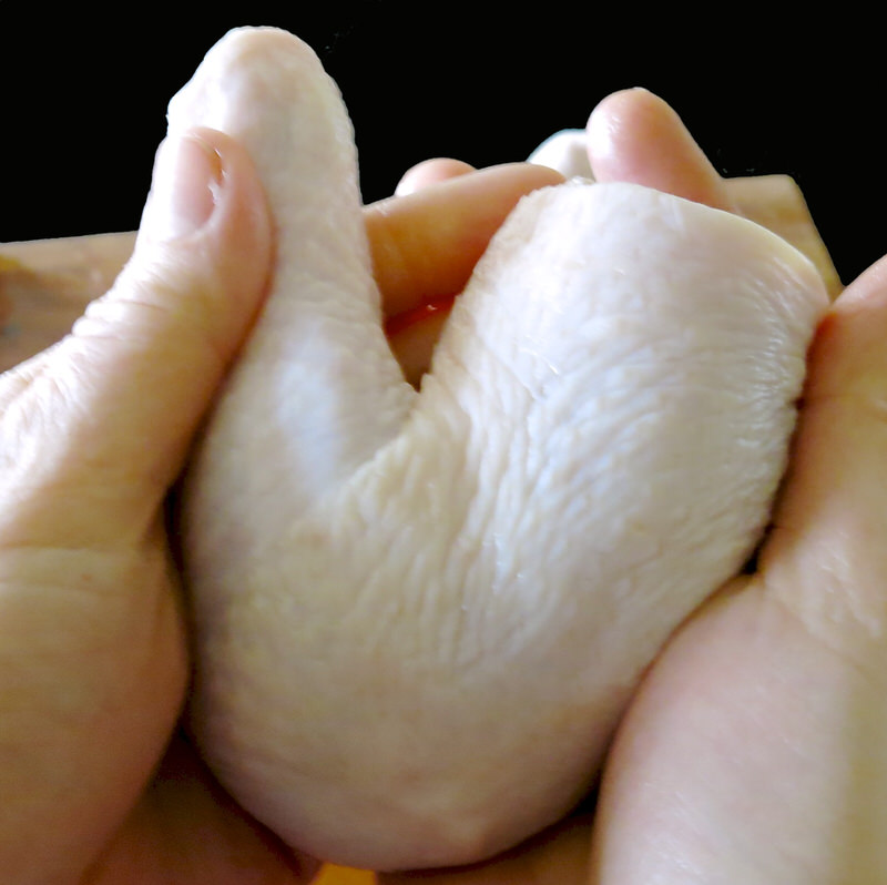 Using the same methodic process for every slice: knife blade at 45-degree angle, hand holding the tip of the knife down while the other hand applies the pressure to cut through the bone to first divide the breasts, above…