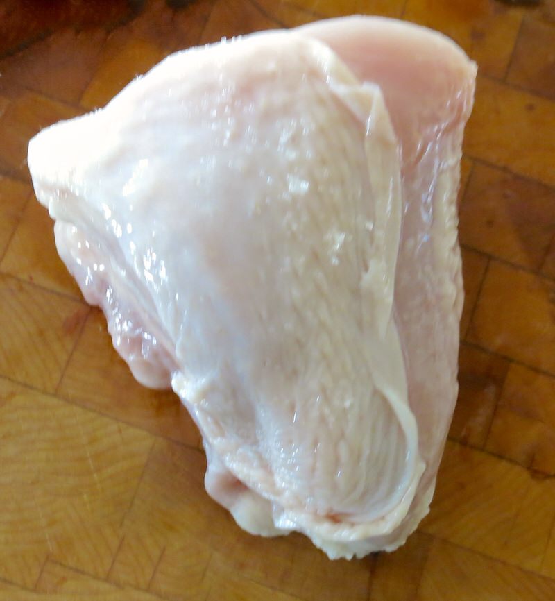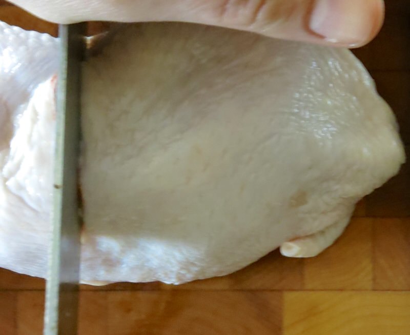 - Repeat with second breast; set aside and note that there are now 8 similar sized pieces of chicken ready to prepare for recipe