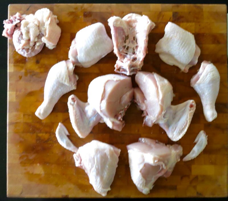 Elyse has artistically arranged the whole chicken portioned into 8 fairly evenly sized pieces close to its original form with the pieces for the stock set on the side (except for the wing tips, added for aesthetic purpose.)