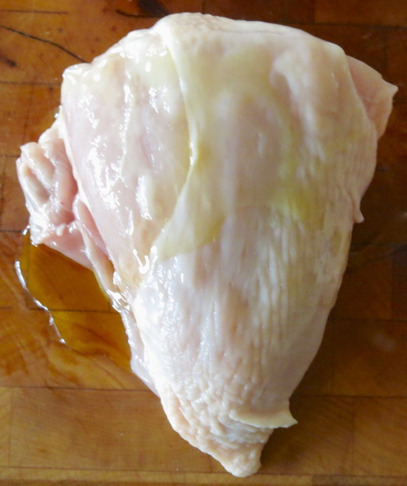 Time to prepare the pieces for the rub. Each is doused with olive oil massaged into its skin, then seasoned with fine salt.