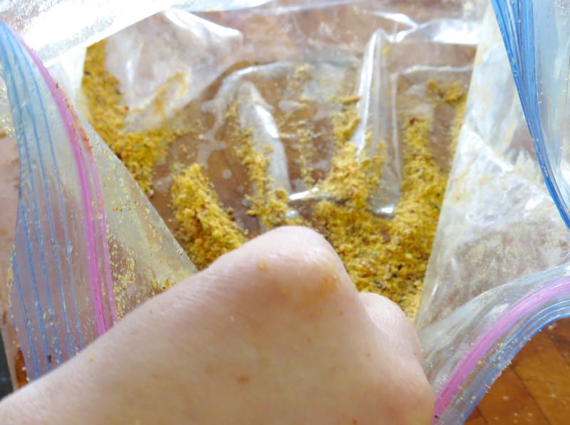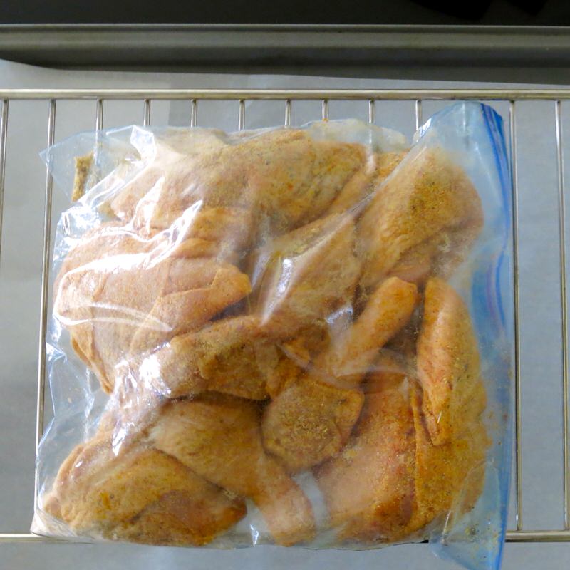 Large Ziplock bag works well to dredge chicken, ensuring all pieces well coated with rub