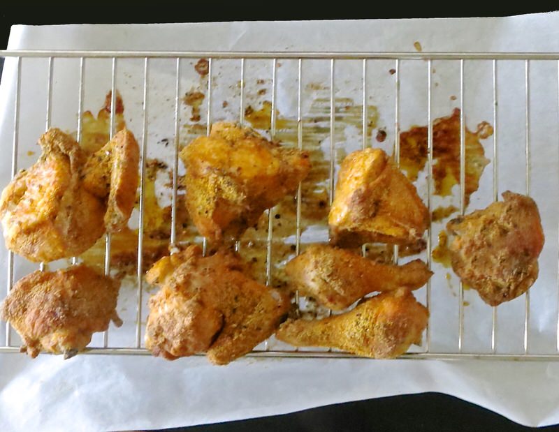 One entire chicken butchered into eight gorgeous pieces, rubbed with the magic mixture and baked until crisp, golden and juicy, above. Simply irresistable.