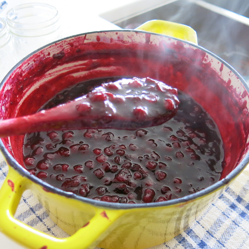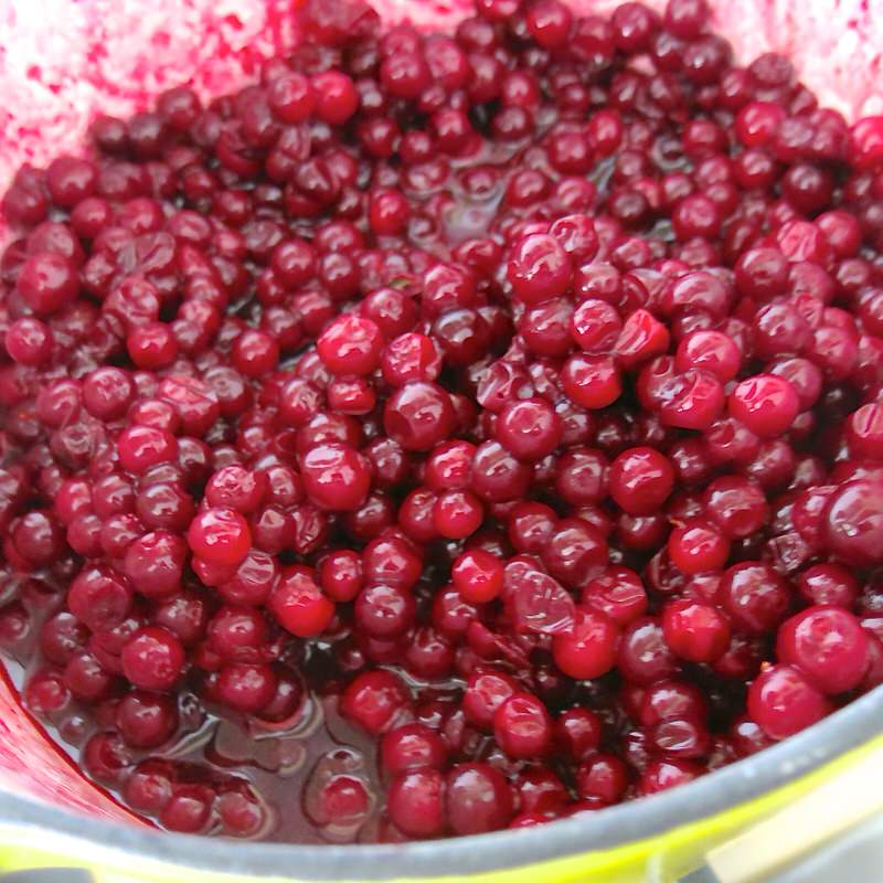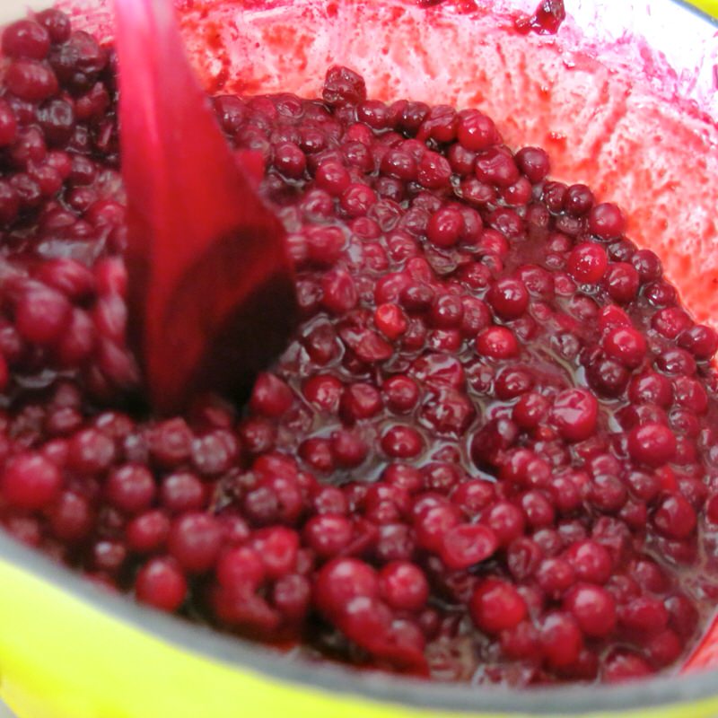 The berries are extremely puckery at this point. Emily likes her jam to be sweetened very moderately. Joy thought 2 cups sugar to 6 cups berries would be the right amount for Emily’s Partridgeberry Pucker and knowing jams are often cup to cup sugar to berry, I was certain she was right.