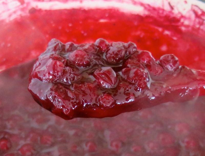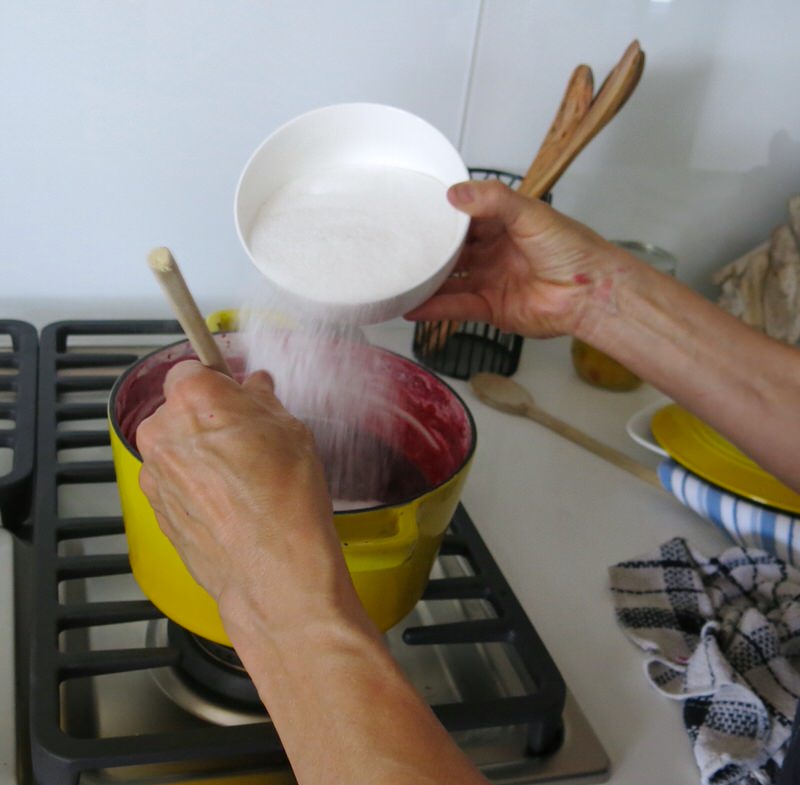 Some of the berries have burst, the liquid is bubbling and thickening. Time to add the sugar.