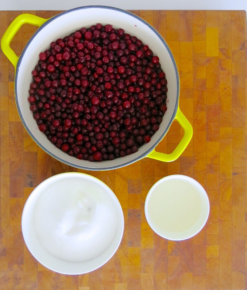 Mis en place, above. Three simple ingredients: berries, water, sugar. No pectin required.
