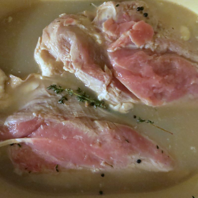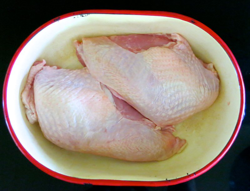 The breasts are brined for 12 to 16 hours, turned a couple of times, and kept well covered in the fridge.