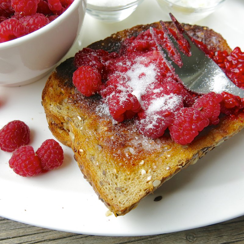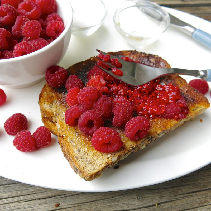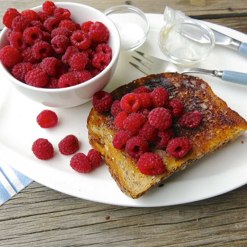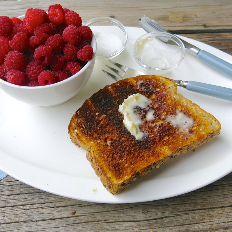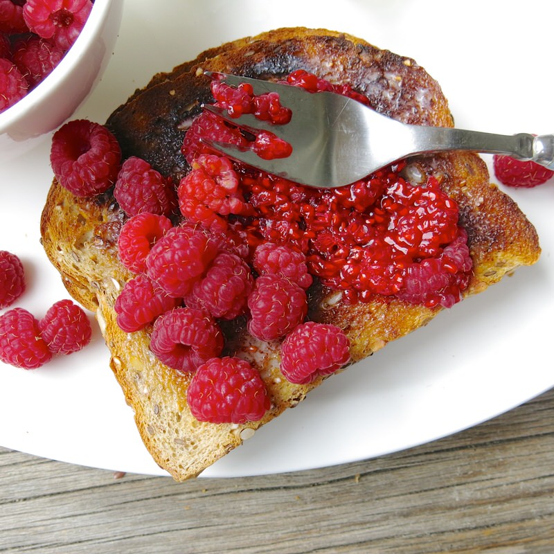 Dark toast. Ah, in this small plate, memories of both my dad, and my grandmother Maude. Dad loved his toast dark, and Grandma Maude grew the best raspberries on the planet.