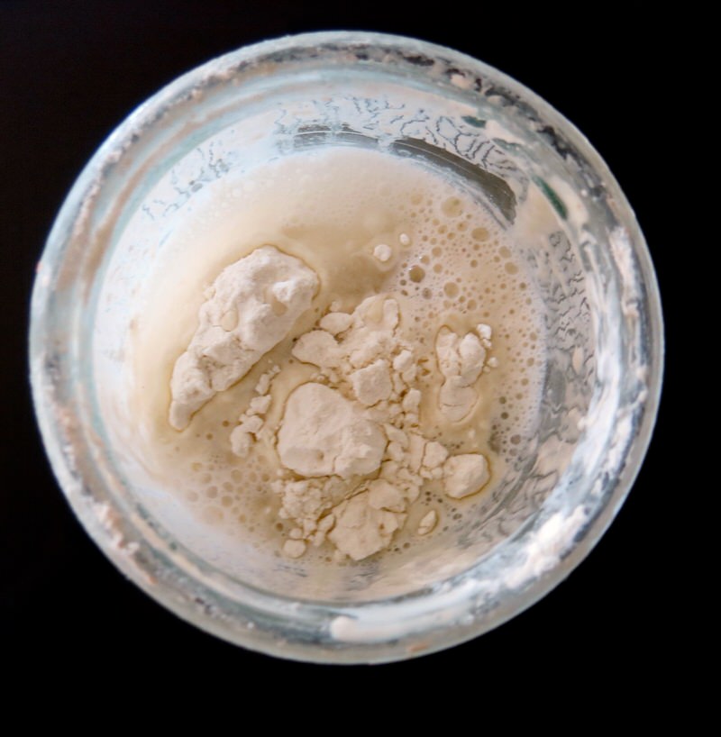Then half was discarded and the other half poured back into the jar with 225 grams of water and flour added to the Starter to create the Sponge.