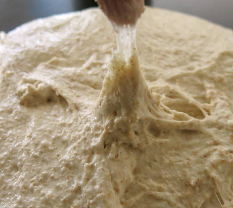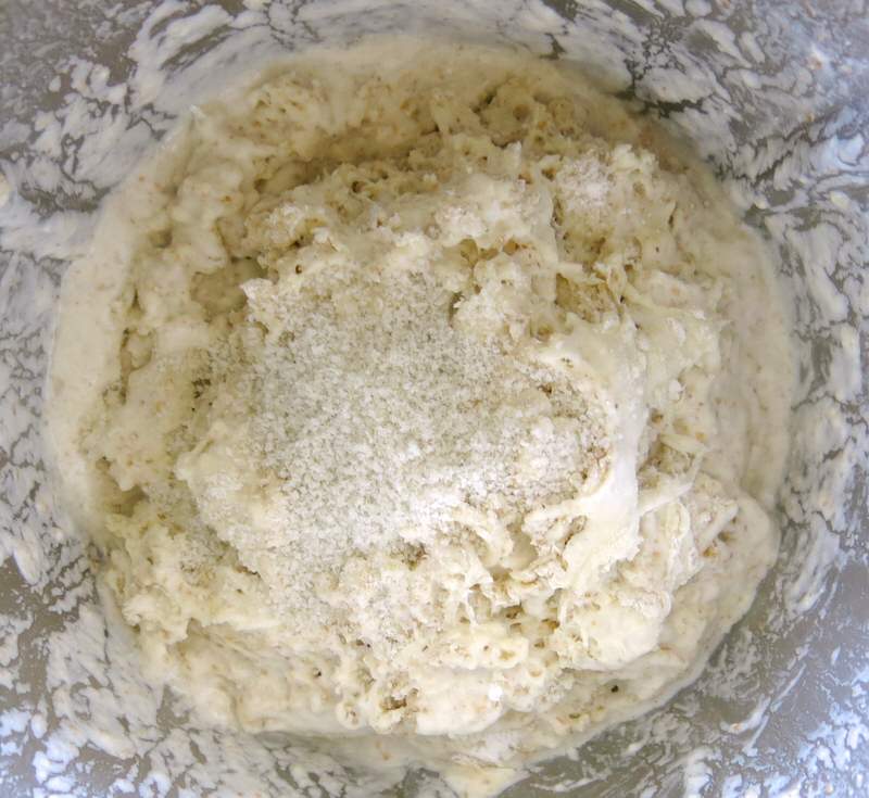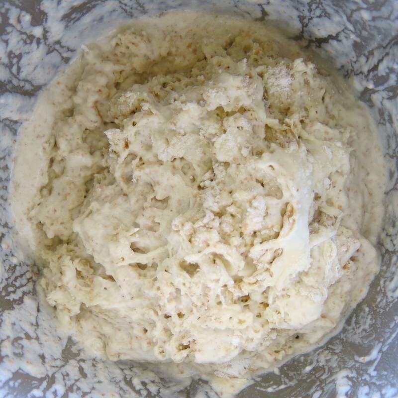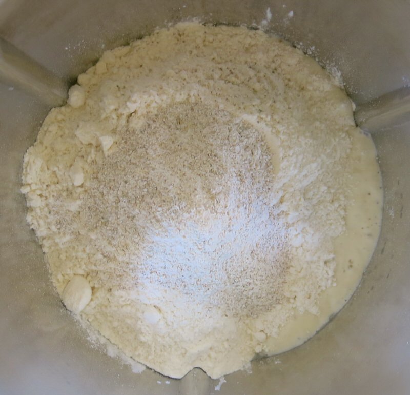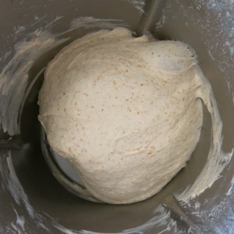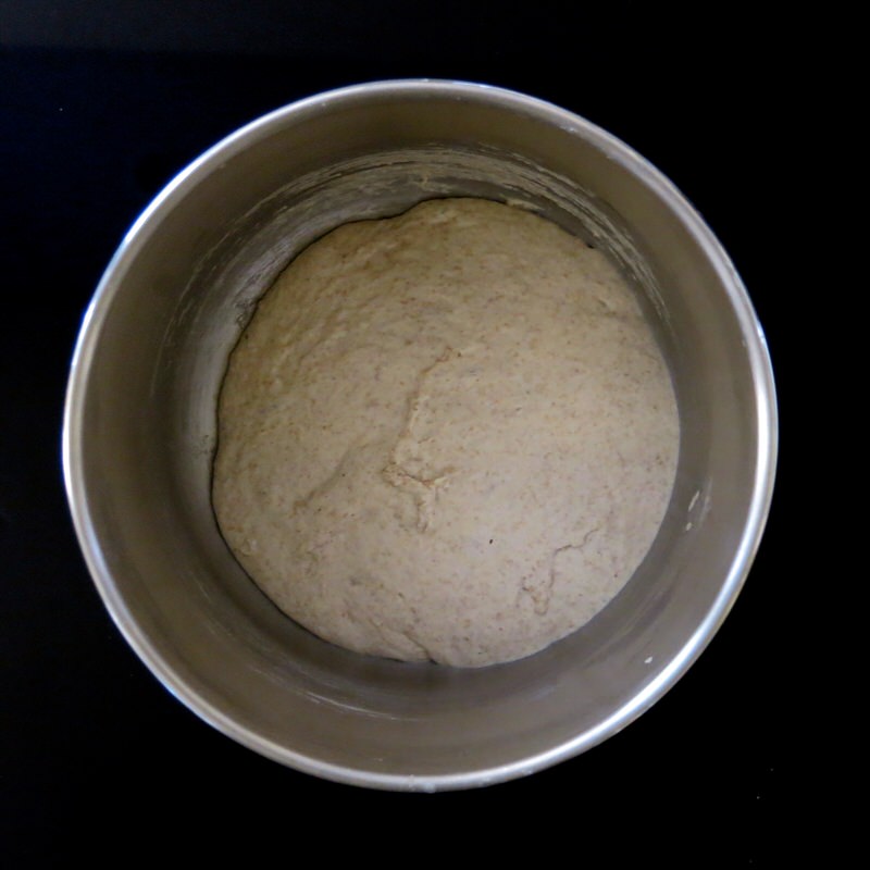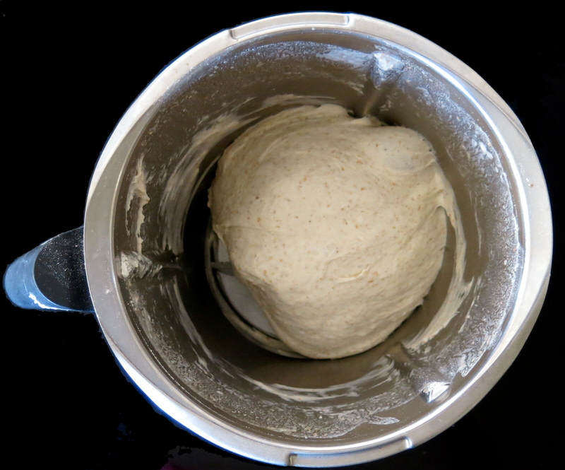 Mix the ingredients until they clump together to form a loose mass. Cover TM bowl with plastic wrap and rest for 20 minutes. This is a technique called “autolyse”. That enables the dough to be easier to work with and shape as well delivering a loaf with better texture, rise and flavour. Do not knead. Simply incorporate all flours until wet, cover the bowl and leave in a warm place for 20 minutes to up to 3 hours. This is when the gluten development begins and simple sugars start to form as starch is broken down. It certainly looked like nothing was happening. I didn’t hear any little snap-crackles-or-pops from the covered bowl, but the texture of the mass becomes smoother and more elastic after this “break”, or process.